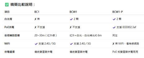 BC1:入門款、CP值高,適合已有 WiFi 環境,需求單純的戶外監控。
