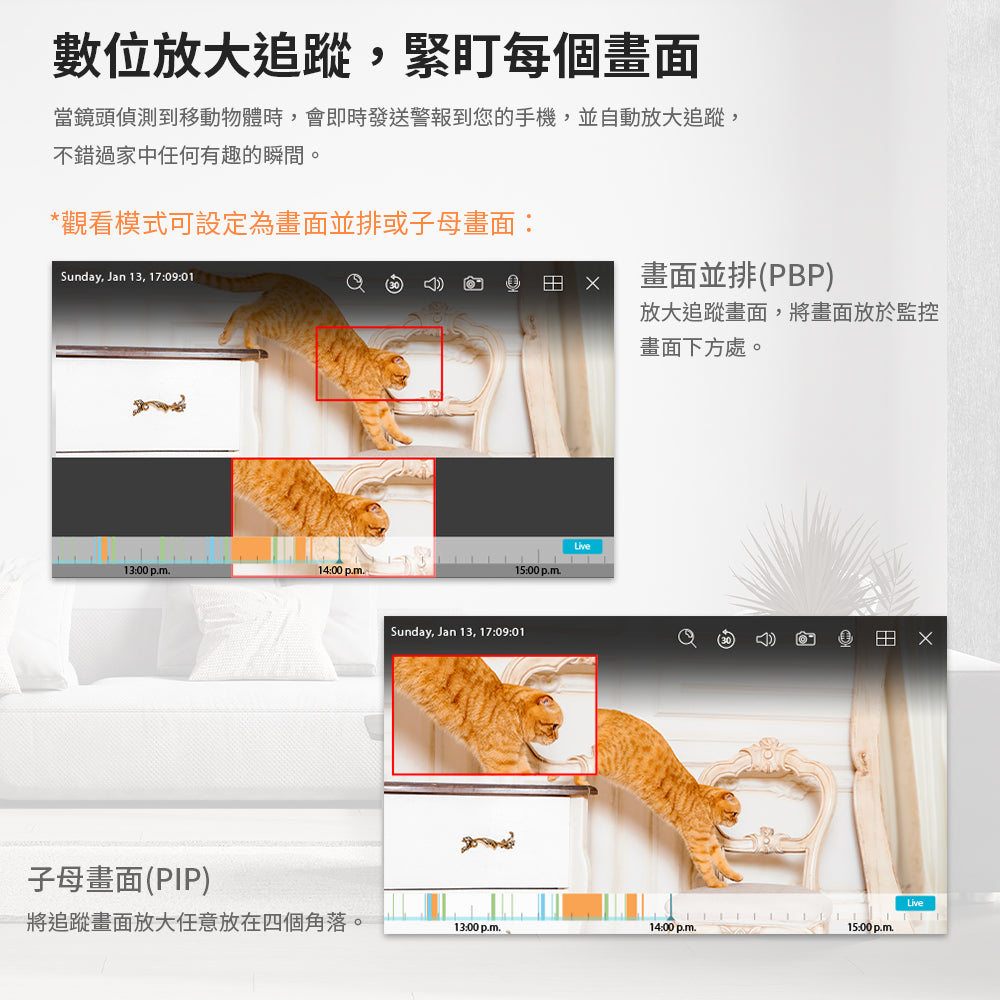 畫面會有自然的廣角視覺延伸,但不影響人物與空間辨識,且支援數位放大追蹤,使用者可依實際需求調整觀看方式,達到最佳觀看體驗。