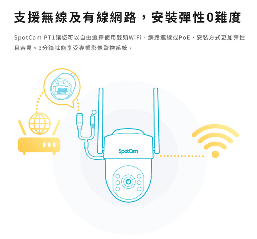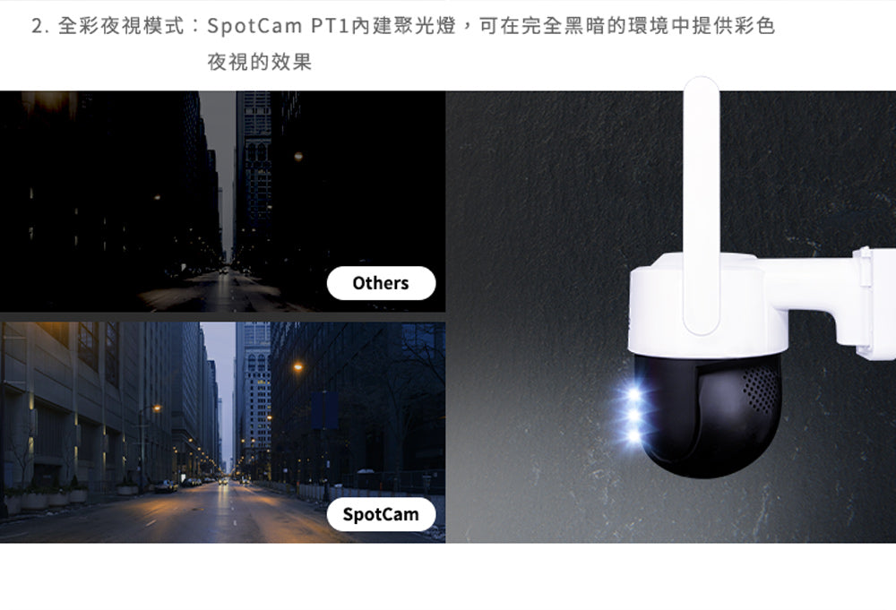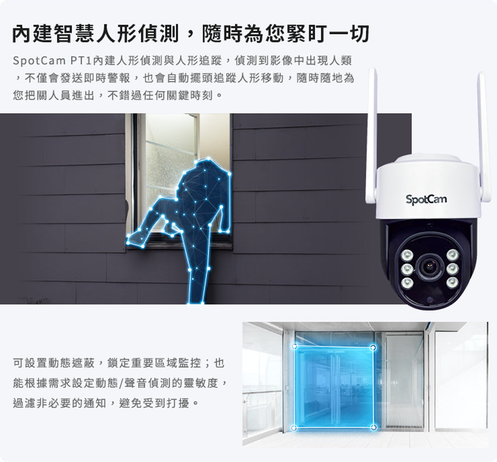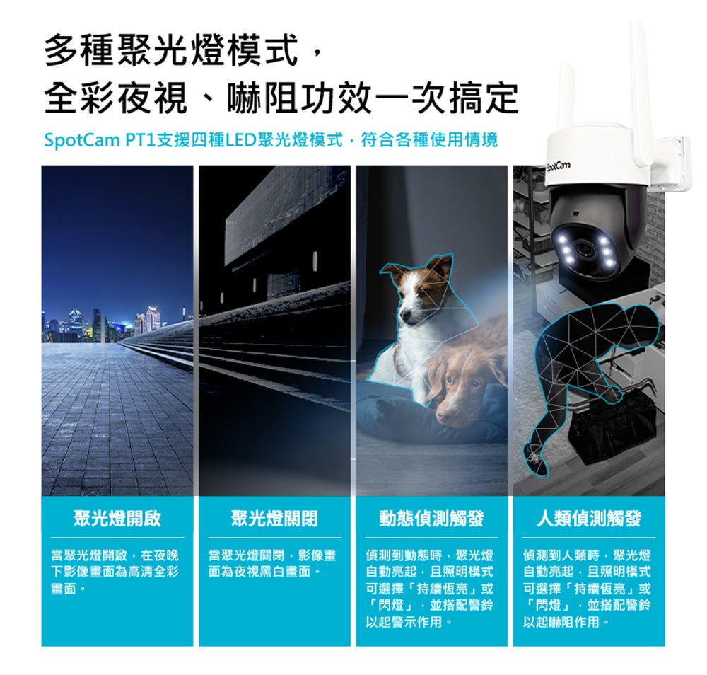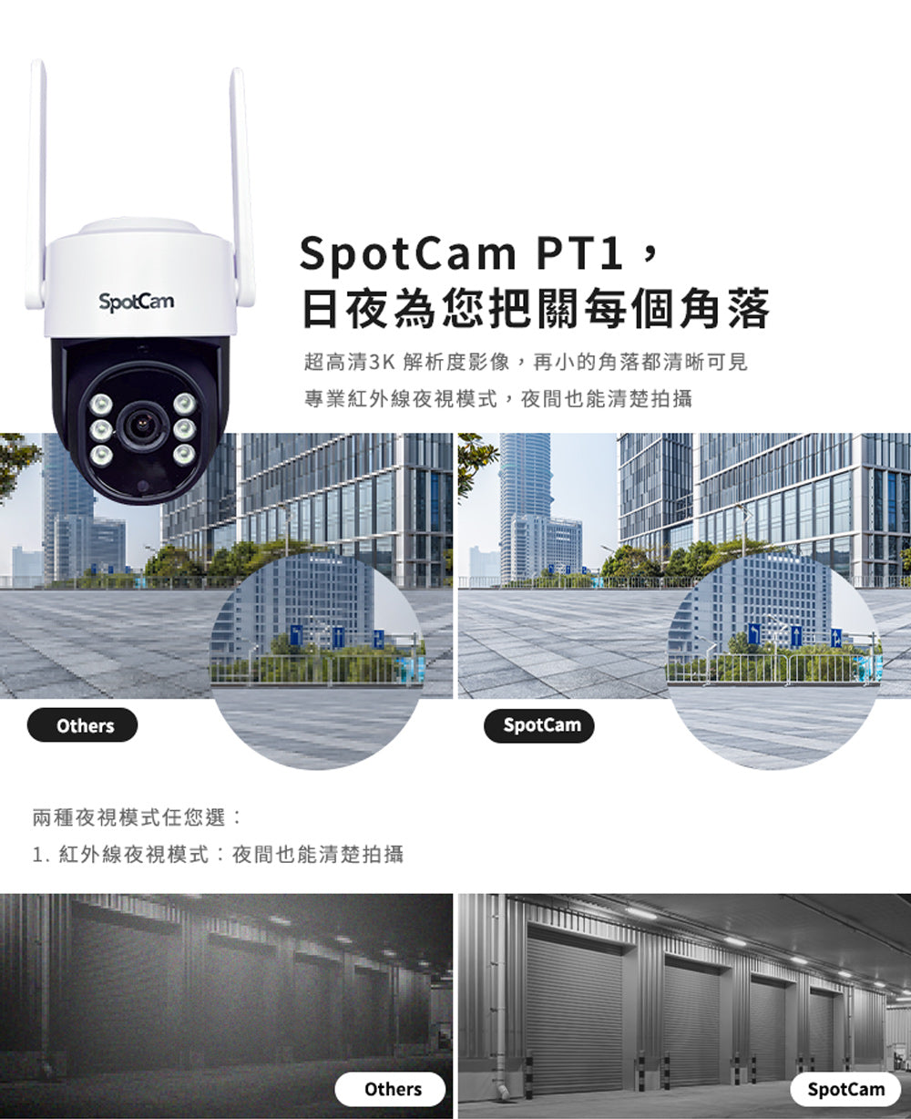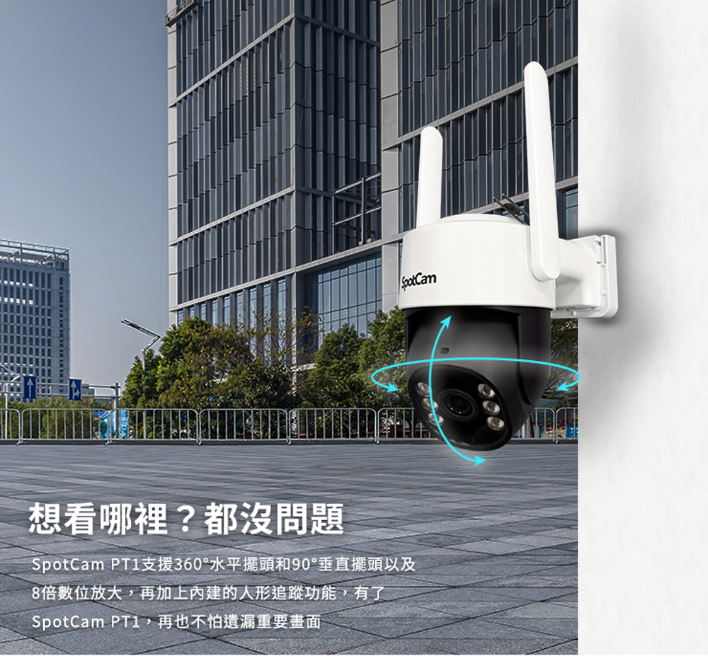 PT1可以遙控角度,防水係數是IP65,適合有遮蔽物的戶外環境唷。
