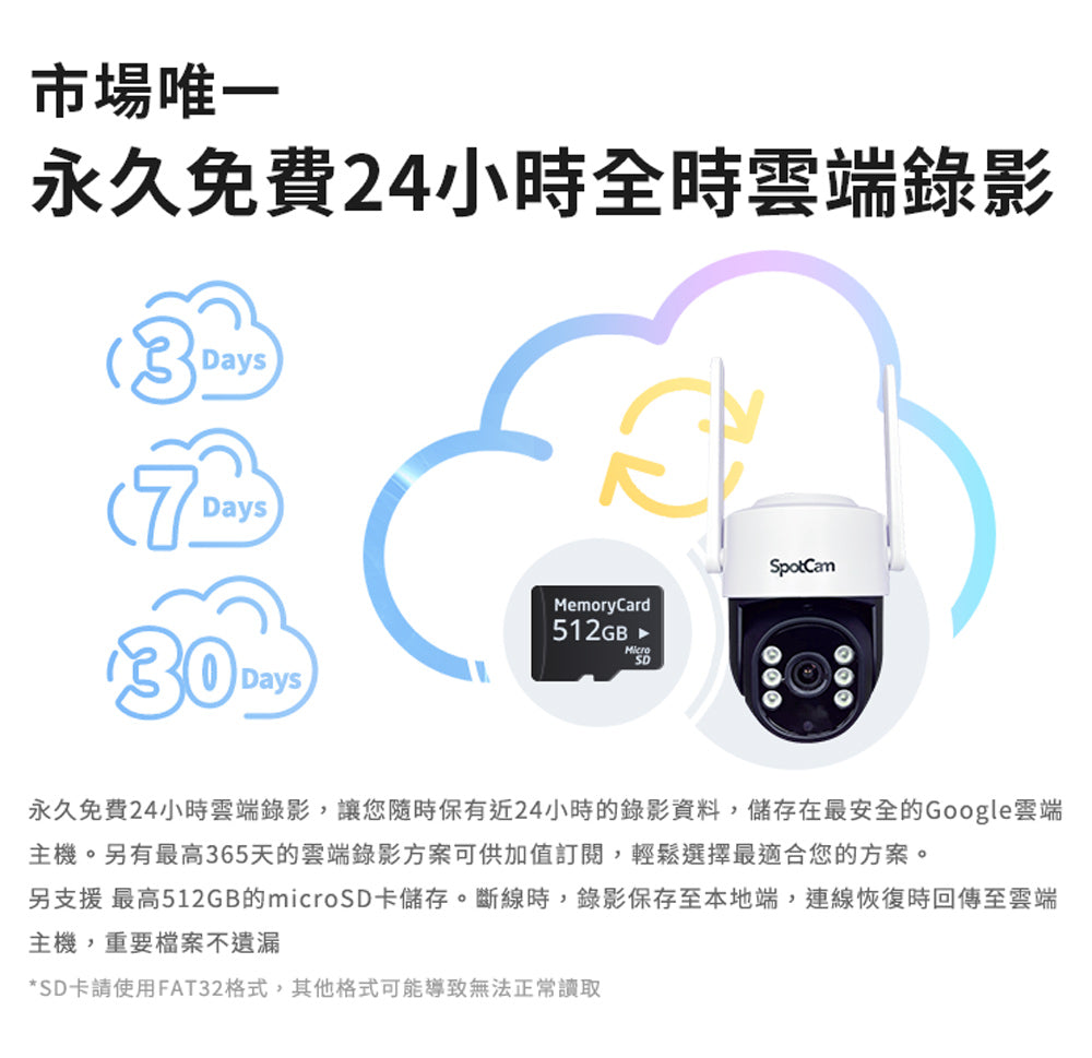 免費24小時雲端儲存 支援SD卡 (最高可達512GB) |